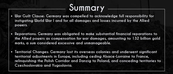 These included the loss of territory, the reduction of Germany's military to a small defensive force, and the payment of war reparations to the Allies.
