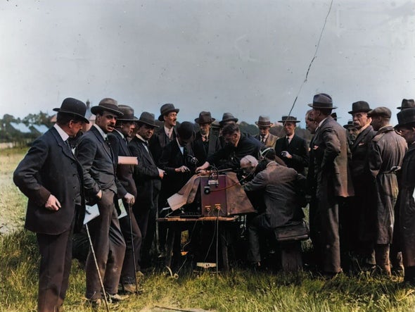 A group waits for news out of Versailles by a wireless Marconi radio, June 1, 1919.