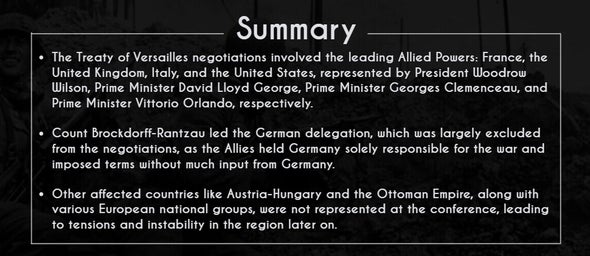The German delegation was largely excluded from the negotiations, as the Allies believed that Germany was solely responsible for starting the war and should accept the terms of the Treaty without question.