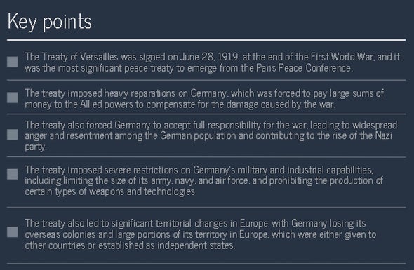 In addition to this, the treaty also included the provision that Germany would pay for the cost of the war itself. This meant that Germany had to pay for the war damages suffered by the Allies, which included everything from rebuilding infrastructure to compensating the families of fallen soldiers.