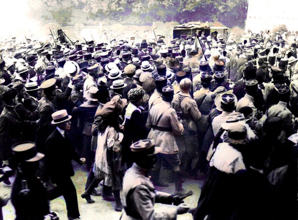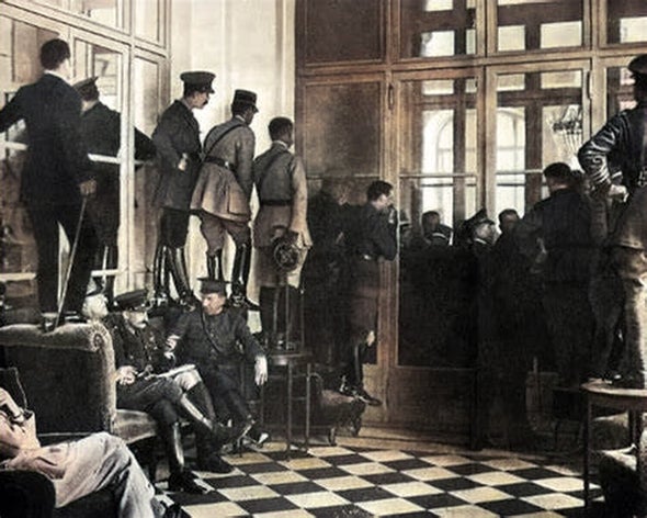 Crowds rush to the Palace of Versailles shortly after the signing of the treaty to celebrate the formal end of the First World War.