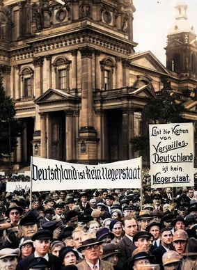 Racist banners at a Nazi-led rally against the Treaty of Versailles, June 28, 1933. The sign at the right reads, “Lose the chains of Versailles, Germany is not a Negro state.”