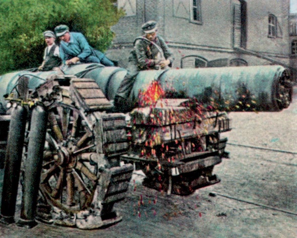 Workmen decommissioning a heavy gun, to comply with the terms of the Treaty.
