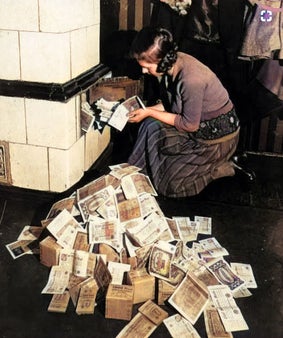 Germany 1923: A woman burns German marks in the furnace to heat the home during the peak of the Weimar Germany hyperinflation - caused by the high cost of reparations Germany were forced to pay as agreed by the Treaty of Versailles.
