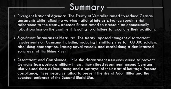 These disarmament measures were seen as a way to prevent Germany from becoming a military threat again in the future. The treaty's authors believed that by limiting Germany's military capacity, they could ensure that Germany would not be able to start another war.