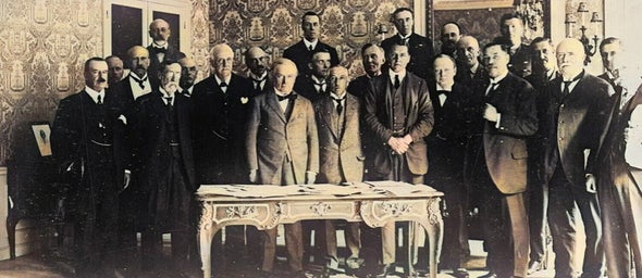 Delegates at the Treaty of Versailles. Winston Churchill is standing in the front row, third to the right of Prime Minister David Lloyd George. Chief of the Imperial General Staff, Sir Henry Wilson is immediately behind and to the right of Churchill.