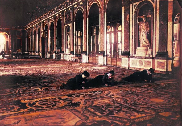Workers put the finishing touches on sewing the carpet inside the conference hall before the signing of the treaty, June 28, 1919.