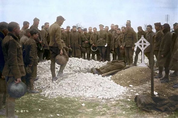 “A Burial Service at the Front.” Funeral of Major E.L. Knight, Eaton Motor Machine Gun Battery. October 1916. After over four years of death and destruction, the world was ready for peace.