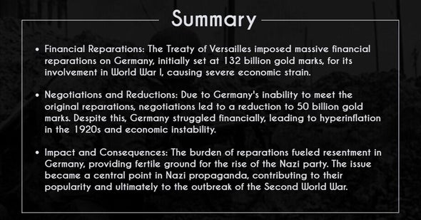 This led to negotiations, and eventually, the reparations were reduced to 50 billion gold marks. Germany struggled to make even these payments, and the issue remained contentious in German politics throughout the 1920s and 1930s.
